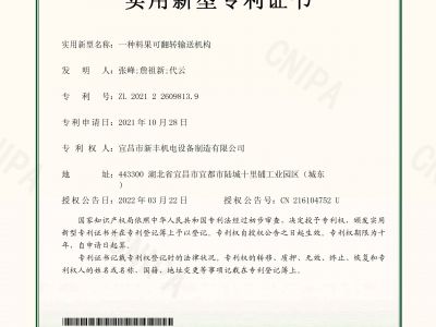 實用新型專利證書《一種料果可翻轉(zhuǎn)輸送機(jī)構(gòu)》