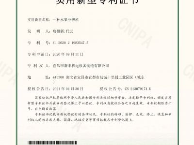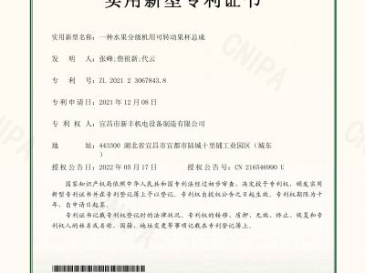 實用新型專利證書《一種水果分級機(jī)用可轉(zhuǎn)動果杯總成》
