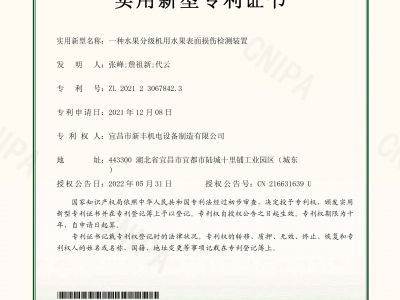 實用新型專利證書《一種水果分級機(jī)用水果表面損傷檢測裝置》