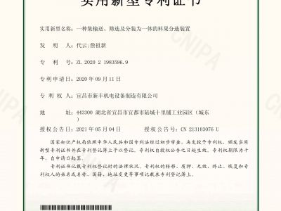 實(shí)用新型專利證書(shū)《一種集輸送、篩選及分裝為一體的料果分選裝置》