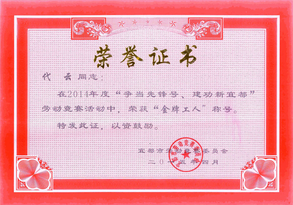 宜昌市新豐機(jī)電公司技術(shù)部長(zhǎng)代云同志,在2014年度“爭(zhēng)當(dāng)先鋒號(hào)、建功新宜都”勞動(dòng)競(jìng)賽活動(dòng)中,經(jīng)宜都市勞動(dòng)競(jìng)賽委員會(huì)評(píng)選為“金牌工人”榮譽(yù)稱號(hào)。