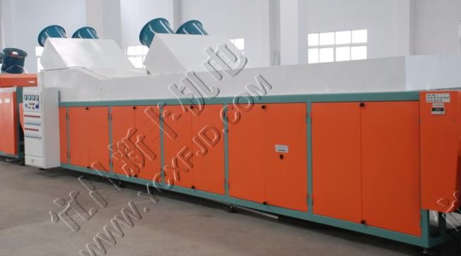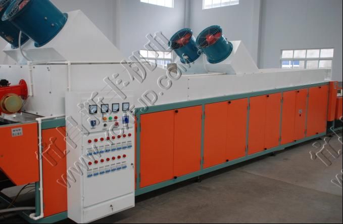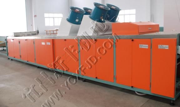 熱風(fēng)機(jī)換能器單獨(dú)布置,提高熱效率,經(jīng)干燥后的熱風(fēng)經(jīng)過(guò)風(fēng)機(jī)加速直接送進(jìn)干燥道,通道內(nèi)空氣濕度低于25%,溫度不均勻度不超過(guò)±2℃。柴油燃燒機(jī)采用意大利產(chǎn)品,提高了干燥系統(tǒng)運(yùn)行的可靠性。采用高穩(wěn)定性的溫度控制器和傳感器,克服了普通控制器不穩(wěn)定帶來(lái)的溫度慣性和漂移,最終使干燥道溫度恒定在設(shè)定范圍內(nèi)(建議設(shè)定值:上限為30℃,下限為26℃)。